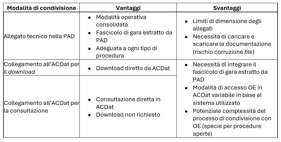 Inoltre, è utile notare che questa modalità operativa prevede il download della documentazione di progetto dall’ACDat, il successivo caricamento tra gli allegati alla procedura di gara all’interno della PAD e l’ulteriore download che dovrà essere effettuato da ciascun operatore economico. Queste operazioni, oltre a richiedere un tempo variabile in relazione alla dimensione dei file, espongono al rischio di corruzione dei file stessi (specie se messi a disposizione attraverso cartelle compresse).